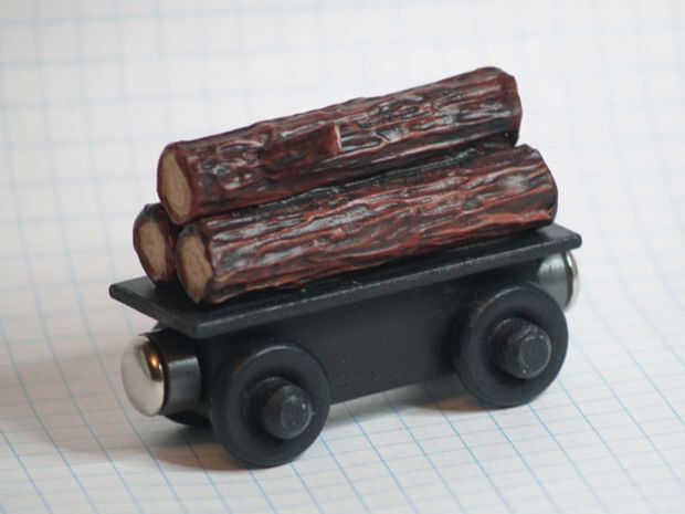 En la última película de 'Thomas' gran parte de la historia gira en torno a transportar "Registros de Jobi" al centro de rescate. Corté 3 secciones de 3/8" espiga en ligeramente diferentes largos, alrededor de 3" de largo pintado con una capa base de marrón rojizo. Ahora, usando un palillo de dientes, corrió una gota de gel medio alrededor de los bordes de la espiga y dibujó las líneas gruesas del gel a lo largo y permite que se seque.  Estaba feliz con el espesor de la capa primera, así que simplemente puse otro directamente encima de la primera para darle cierta dimensión real. Una vez que el gel había secado comencé a aplicar varias capas de pintura con un pincel muy seco, a partir del color base y añadiendo colores progresivamente más oscuros en la parte superior y luego hacer un lavado de suavizado más negro y superficies de la pintura, dejando sólo las grietas. Finalmente he añadido unos luz destaca y deja que todo seque completamente antes de terminar con una capa de barniz y pegado los tres en una pila. Después, había montado directamente al chasis base.