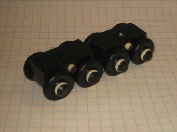 Chasis: Para los trenes más largos que la rueda 6 uno descrito, el chasis se deben dividir en dos camiones articulados por lo que se pueden navegar las esquinas estrechas. El motor de Energía Nuclear será un 8 ruedas de tren con dos carros individualmente pivotantes - a continuación se muestra el trabajo en progreso. Escala abajo que el reactor de uranio a 3/4" está resultando problemático así... estad atentos.
