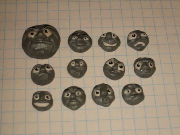 Se enfrenta a: Utilizando un paquete pequeño de blanco y gris masa FIMO he podido esculpir una docena o tan pequeñas caras para usan en los motores. Voy empezar con una bola de arcilla en el extremo de un pasador tamaño adecuado uso dos bolitas de FIMO blanco para los ojos y entonces construir una cara alrededor de ellos. Yo uso hilo para corte de la espiga y luego hornear a baja temperatura en nuestra tostadora durante unos 15 minutos. Después de la cocción son de plástico duro y puede lijarse en la parte trasera y pegado a la caldera de un motor.