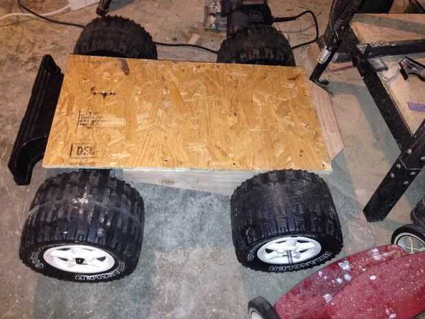 Perforar el 2x6s deslizar el eje trasero a través de. I los orificios perforados y utiliza los originales PowerWheels suspensión delantera sección agujeros y los tornillos.