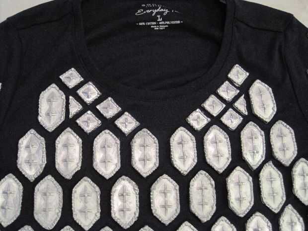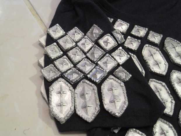(Consejos: si tus escamas son tipo de espesor, debe hacer las mangas primero antes de hacer la parte delantera de la camisa. También, cuando pegado a escalas, intente poner el pegamento en el centro, en lugar de pegar por los bordes de las escamas. La camiseta será más flexible así.)