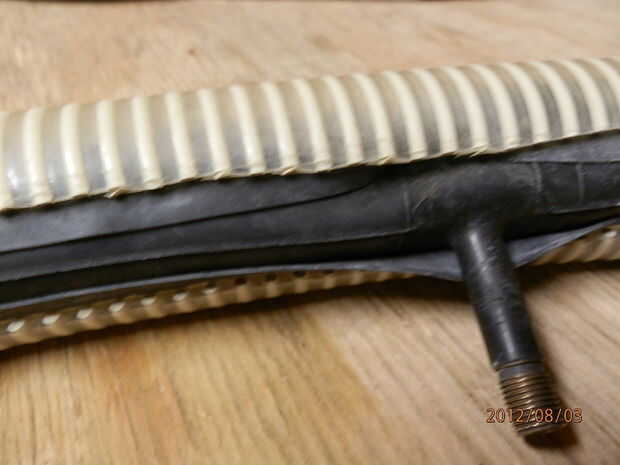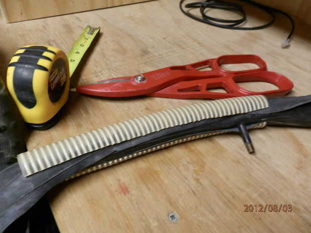 Paso 2: Prepare el tubo interno viejo. Corte de la espiga del tubo interno pero no a través del tubo interno. Cortan el tubo interno entero a lo largo como el tubo de plástico por encima. Poner la vieja corte tubo interno alrededor de la llanta buena.