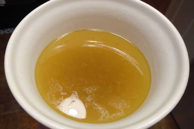 Cuando esté listo para usarlo, Desnate la grasa coagulada de la parte superior. Y ahí lo tienen, poco caldo de pollo casero, gordo. Agregue arroz sobrante, perejil picado y muslo de pollo en rodajas para un almuerzo nutritivo.