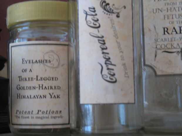 8. busto de la computadora y la impresora y el get creative. Comenzar a diseñar algunas etiquetas básicas. Utilizar el sitio Web searchfreefonts.com para algunos fo las fuentes más escandalosas o espeluznantes, o comercio marcado fuentes como la escritura de la Coca-Cola a ver en mi botella de 'Corporal Cola' [cholula]. Que los niños involucrados en la fabricación de nombres; Utilice el tesauro liberalmente. Tengo ejemplos de mi iteración escaneadas en debajo de ideas. Otra gran manera de involucrar a los niños y aprender sobre su vecindario (ver mamá! Halloween es educativa!) es para dar un paseo. Comience a buscar en el mundo natural para la inspiración. Tenemos algunos árboles que ramas de gota que yo creo que parecen diminutas espinas. Las pequeñas coníferas alrededor de la esquina las gotas diminutas agujas de pino que casi parecen pestañas. La pasarela de mimbre forrado tiene hermosas bayas blancas que de repente las verrugas albino (u ojos). La piel de ajo y cebolla en la nevera sólo parecen alas de hadas en escabeche! Especificidad es la clave--el más específico es, más exóticos y humor el producto final. El mundo con nuevos ojos y enseñar a los niños acerca de género y las especies nativas de su área como vas! *