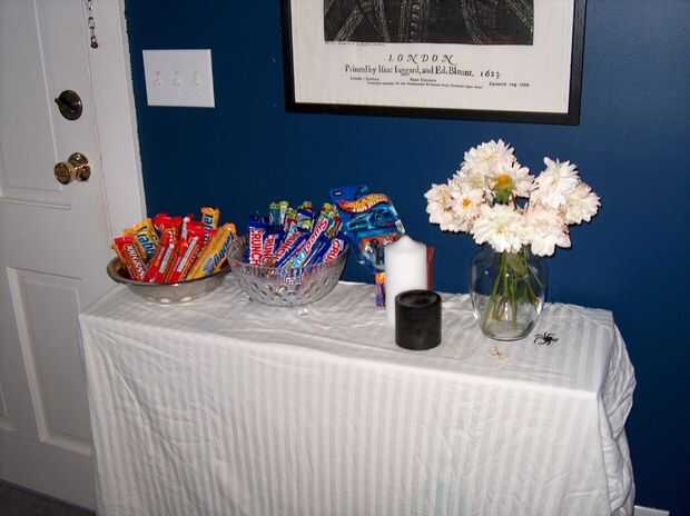 10. pantalla! Su tablescape del arte con un corredor de la tabla base (algunas tela Halloween o, como es el caso aquí, de un negro elegante swirly algodón calico serged o dobladillo alrededor de los bordes), algunos de plata bandejas de tienda de segunda mano, velas, candelabros, sus tarro impresionantemente creativas muestras de pociones y algunos símbolos del libro mágico. ¿Qué es eso, usted pregunta? Bueno, el siguiente paso le mostrará lo que estoy hablando.