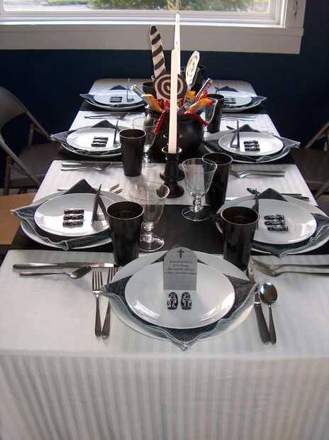 27. lápida marcadores de mesa: componen concisa, epitafios de rimas. Imprimir sobre papel gris o utilizar escala de grises. Cortarlas en forma de una lápida. Con negra o gris de la cartulina o cartón como soporte, pegue el gravestone impreso a la cartulina. Hacer un triangulo pedazo como soporte y péguelo en la parte posterior de la lápida.