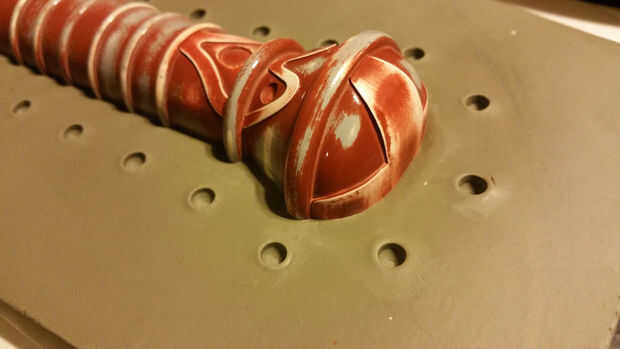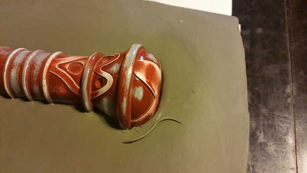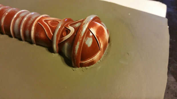 El mango fue pulsado en la arcilla, arcilla pequeños gusanos fueron puestos en la arcilla y el mango se reunieron, entonces ellos fueron alisadas para llenar la línea de costura.