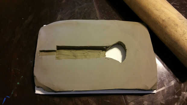Lanzó una losa de arcilla sculpting no azufre (la arcilla debe estar basado no sulfuro o la silicona no se curará completamente) lo suficientemente grande para el mango, y tiene espacio para las claves de registro para el molde y la chaqueta de molde. . Claves de registro son imprescindibles! Sin ellos, los dos lados de una chaqueta de molde/molde, no se alinean correctamente. Pongo la arcilla en un pedazo de tablero de la espuma así podía moverlo alrededor si es necesario. Me puso la manija en la arcilla y "había trazado" con una herramienta de escultura. Luego cavé hacia fuera de la arcilla dentro de la forma trazada. Hice el cavado un agujero ligeramente más pequeño que el mango. Esto hizo suavizar la línea de la costura más fácil, porque había poco que haya espacios entre la arcilla y el mango.