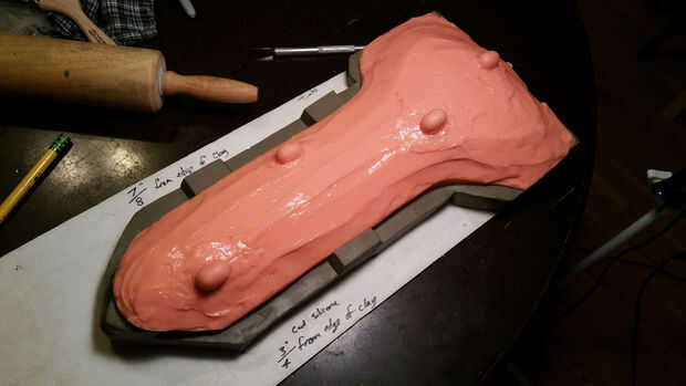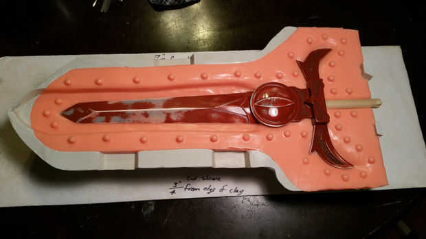 Se formó una tortilla gruesa de la arcilla, entonces la daga fue trazada y corte de él. El cuerpo de la daga fue "plantado" en la arcilla, se creó una línea de costura y claves de registro añaden. Tengo que hacer un segundo nivel de arcilla para la hoja Debido a la diferencia de altura de la hoja en comparación con el cuerpo. Se aplicaron varias capas de silicona con las claves de registro a las finales dos capas. El borde de silicona fue recortado y claves de registro fueron añadidas a la arcilla. Un borde limpio alrededor del molde se cortó con un cuchillo X-acto.
