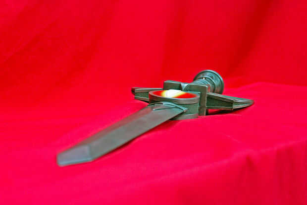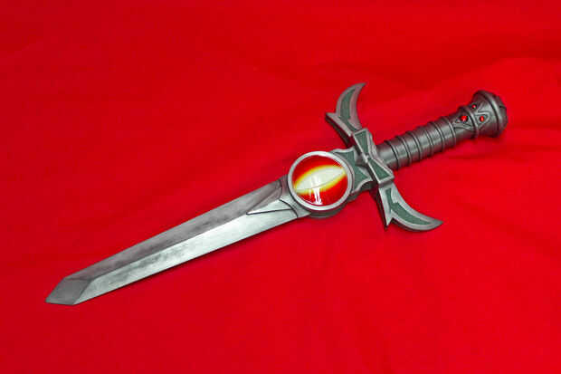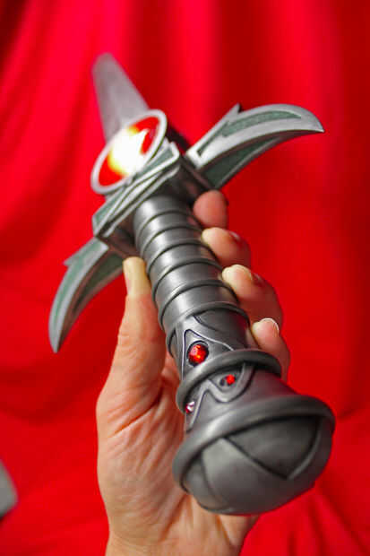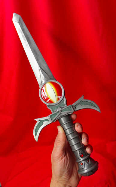 Corté un pedazo corto de pvc de la misma pieza de pvc utilizado para hacer los anillos para el ojo de Thundera y colocó en el ojo de Thundera. Esto era una manera fácil de máscara la daga mientras clara capa la pintura en el ojo de Thundera. Sí, lo único claro cubrió esta área, utilizando una capa de uretano transparente. Claro yo no capa la daga todo, para mantener la apariencia de metal más cierto. No estaba preocupado por el lavado negro acrílico o pintura de aerógrafo verde viene de. Ellos no están en las superficies donde pintura sería frotar fácilmente apagado. Agua haría que la pintura negra y verde salen más fácilmente, pero la daga tendría que ser mojada para más que un breve momento. Esta daga no debe ser en agua y si lo es, significa la casa se ha inundado, y la pintura en la daga es la menor de las preocupaciones.