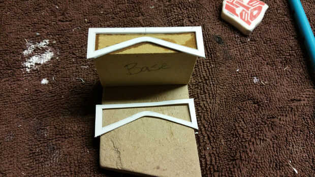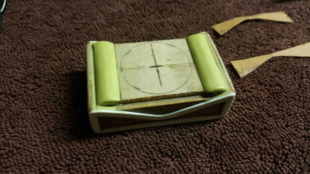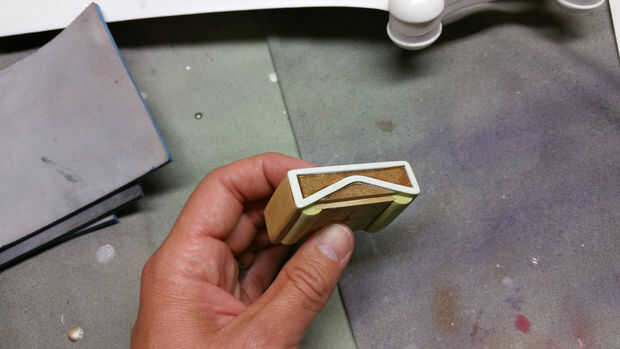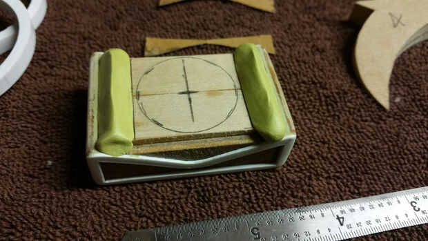 Un pedazo de madera gruesa de 1/8" era centrado y adherido a la base. Dibujado en más guías para la incorporación próxima de Milliput. Aplica el Milliput y aproximadamente de forma a forma dentro de las guías y deje que se cure. Una vez que se curó el Milliput, arena a la forma adecuada. Los bordes de la Milliput fueron cortados al ras de la madera de 1/8" con un cuchillo X-acto.