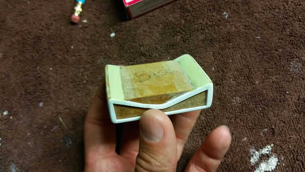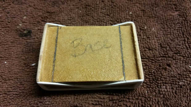 Dibujado en guías en la parte inferior de la base para iniciar la "rampa" que detalla el proceso. El material utilizado para crear las "rampas" fue Milliput, que es una arcilla de epoxi de dos partes que cura en aproximadamente 3 horas dependiendo de la temperatura ambiente.