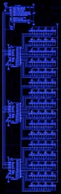 Como ya se mencionó, el hardware es muy simple, la única complicación es que hay muchos componentes para armar. Por lo tanto, vamos a ver cuáles son las partes que utilizamos: una ATtiny84; tres TLC5940; 64 LEDs RGB ánodo común; un condensador de tamaño medio para estabilizar la tensión que, en nuestro caso, proviene de una vieja fuente de alimentación ATX y tiene una pequeña ondulación; cinco resistencias, refiriéndose al diagrama de abajo, R1 y R2 son 10k y R3, R4 y R5 son 1.5 k.