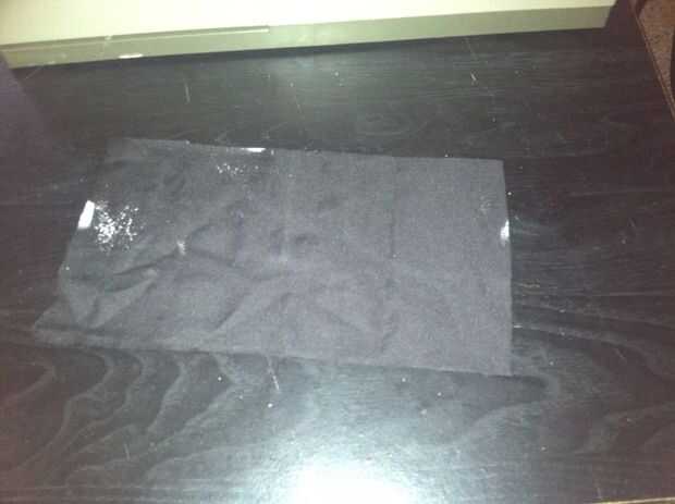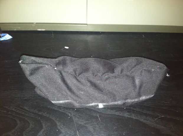 Coser una bolsita de tela de desecho que es de 8 x 4 pulgadas. Coser todas pero una esquina y rellenar con arroz y coser el cierre del orificio. Esta bolsita con el peluche se encuentra en la parte inferior y dar peso a la misma para accionar el dispositivo de sonido.