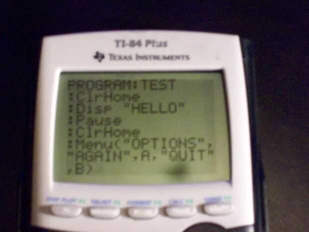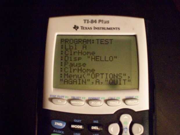 Ok, así que ahora su programa muestra Hola, a continuación vamos a insertar un menú, ir a la pantalla con su programa y vaya a la sección segunda, editar, seleccionar el programa a partir de ahí y le traerá a la pantalla de programación. una vez allí, golpeó el programa y bajar hasta ver el menú, se muestra en la primera foto, seleccionarla y luego ingresar este (nada en el paréntesis), "opciones", (este es el título del menú) "otra vez", (esta es su primera opción) A, (esta es la etiqueta de la primera opción le enviará a) "Dejar de fumar", (la segunda opción) B (su etiqueta 2) si esto es demasiado confuso , basta con mirar la segunda foto. Ahora el programa tendrá un menú con dos opciones, pero no van en cualquier lugar, que si selecciona, tu calculadora sólo le dará un error de etiqueta, lo que significa que no es una etiqueta A o B para las opciones para llevar a. Ahora lo arreglamos. Si nos fijamos en el tercer cuadro, verá que en la parte superior es una etiqueta de la etiqueta A (lbl A) esto significa que si usted elige otra vez, luego se reiniciará automáticamente el programa. la manera de insertar una etiqueta lbl es, primero ir a la parte superior de su programa y golpe Inserte (2 º luego del) y pulsar intro, esto hará que otra línea de una etiqueta lbl. después de haber hecho esto, programa del golpe y al lado de #9 hay una etiqueta llamada lbl, selecciónela e inmediatamente después puso la letra A. Debe dar un lugar para el nuevo lugar para enviarle. Ahora para el lbl B. poner una etiqueta lbl y una B en la parte inferior de su programa. Luego, crear una etiqueta de disp que dice (entre comillas) adiós y después de eso, una etiqueta de pausa. Ahora tenemos una etiqueta de parada, esto hará que el programa automáticamente terminar, primero golpeó el programa, entonces Desplácese hacia abajo hasta la parada y seleccionarlo. ahora si toca salir en el menú, usted verá adiós y entonces pondrá fin a sí mismo (después de llegar a entrar). Así que ahora hemos cubierto todo lo que cubro en este instructable, tiempo para probarlo.