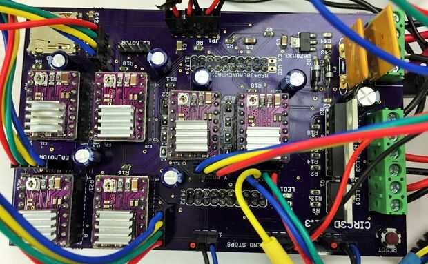 El nuevo PCB está diseñado para ser una versión más modular del tablero original de TI y también añade soporte de dos extrusoras más. Incorpora seis módulos de controlador de motor basados en el DRV8825. Fuimos para un diseño modular porque significa menos smd que suelda y haría que los controladores fáciles de reemplazar.