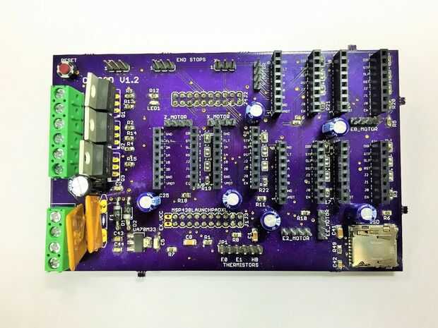 Los seis módulos de controlador de DRV8825 se enchufan en las cabeceras de 8 pines hembra. El conector verde de 6 pines en el lado izquierdo es donde el lecho del termobloque y resistencias de los dos estiradores están conectados. Conecte el conector verde de 4 pines en la parte inferior izquierda es Dónde está la fuente de alimentación de 12 voltios. Tiene 4 pines porque las clavijas dos suministrar el calentador de cama (alta corriente) y los pernos de la parte inferior dos proporcionan energía para el resto del circuito.