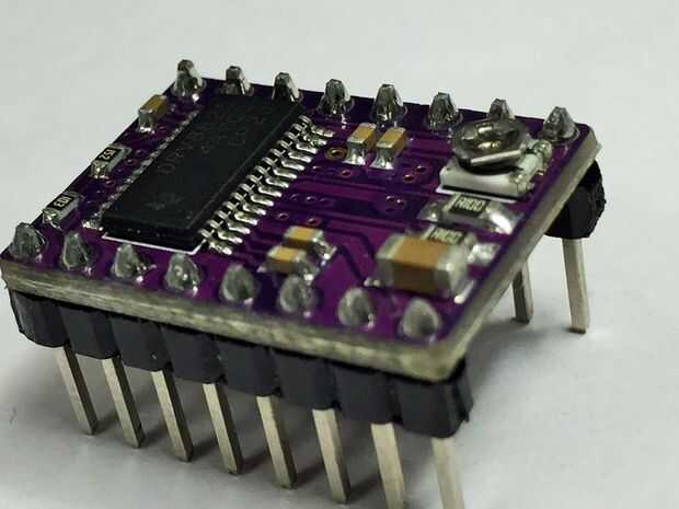 El potenciómetro en el módulo controlador establece la referencia de voltaje usada para limitar la corriente de conducción de los motores paso a paso. Para los motores que utilizamos, una referencia de voltaje (Vref) de 0.9v funcionó bien. Obviamente si está conectando dos motores en paralelo (z en nuestro caso) la Vref se duplicaría a alrededor de 1.8. Es importante afinar este bote correctamente, porque no hacerlo hará que los motores no adecuadamente o sobrecalentamiento.