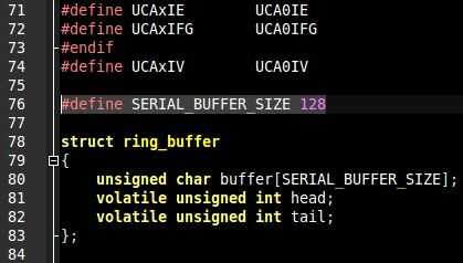 Antes de flashear el microcontrolador (Launchpad) con enrgia necesitamos modificar la constante de tamaño de búfer en el código de fuente de Energia (HardwareSerial.cpp).