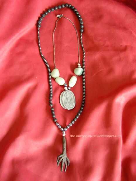 3) esculpir una mano de mono pequeño (cerca de 2.5" de largo), pintarla de color marrón oscuro y coloque en el extremo del collar alambre largo.