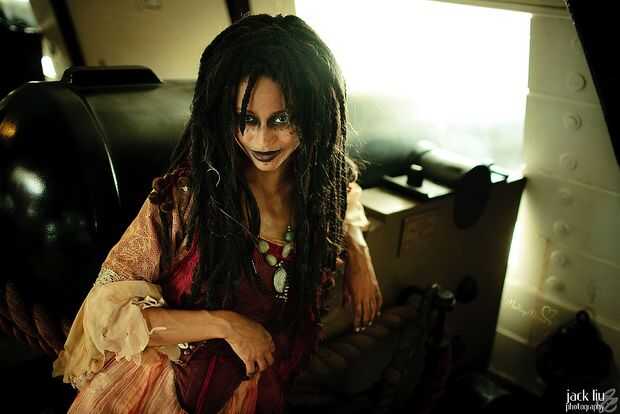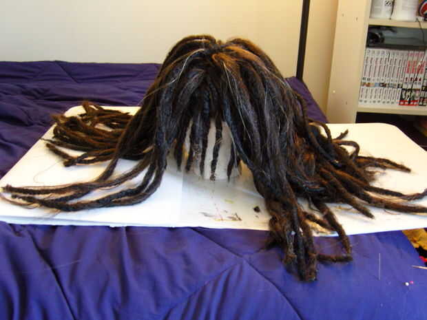 Compré una peluca de interbloqueo que era negro y agregado de largo extensiones "trenza grande" para darle más vida. Tuve que coser la extensión en la base de la peluca, individualmente envolver alrededor de los temores, y luego fijarlo con spray de congelación. Puesto que la Tia tiene el pelo dañada por el sol, algunos filamentos de rubio están tejida en la peluca así.