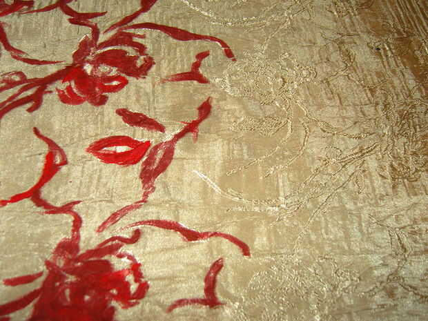 1) como una capa inferior de la falda, me compré un beige satinado con sutiles bordados. Pinté sobre el bordado en la parte de atrás, ya que es menos brillante, con pintura de tela de color rojo oscuro para conseguir el mismo efecto como en traje de Tia. Foto 4 (si tienes suerte y punto beige con bordado rojo, consiguió para él!) El tiempo en la tela encima con papel de lija y untar con pintura marrón y negro en una esponja.
