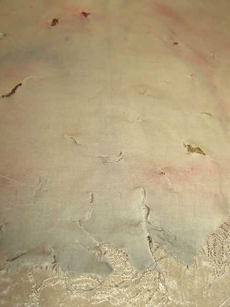 2) fije para la mirada rota en el extremo de las mangas, aproximadamente 5" de la cortina de color amarillo pálida y melocotón esquileos, así como el encaje beige claro. Edad con pintura de tela marrón y negro y río con una cuchilla de afeitar.