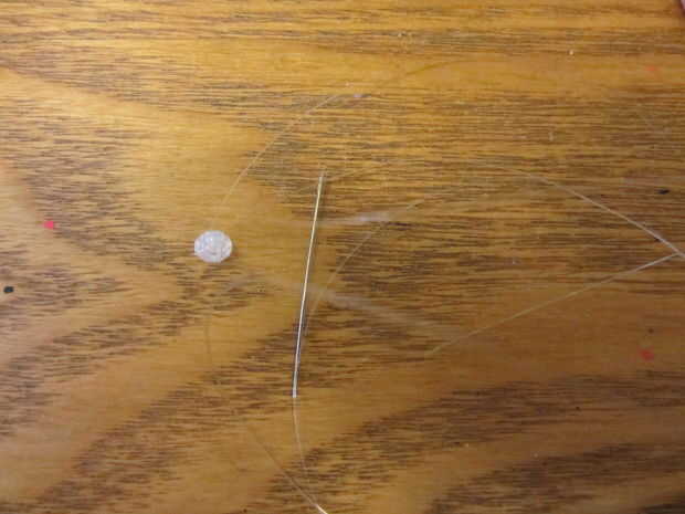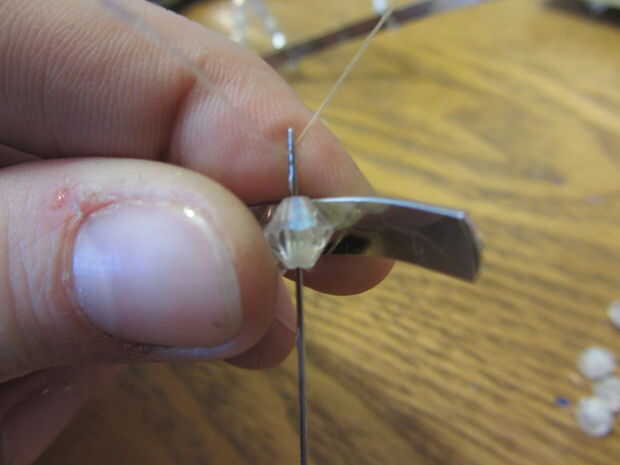 Para grano la otra mitad de la tiara, Enhebre la aguja en otro pie de línea de pesca. Enhebre la aguja por el grano del centro que usted asegurado y un nudo en el interior de la tiara. Cordón, lazo y acabado como el otro lado.