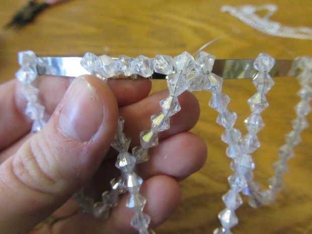 Continúan hilo granos en y alrededor de la parte posterior de la diadema del lazo. Ir hasta el final y después de conseguir el último grano, enhile el sedal a través de la capa tres de cuatro veces y hacer un nudo dentro de la diadema.