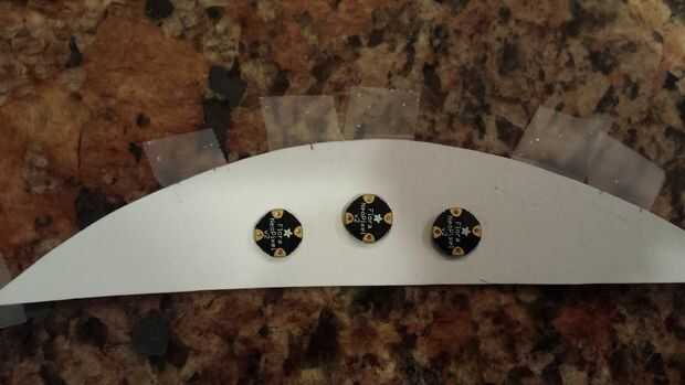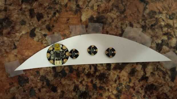 b) encontrar el punto en que las flechas comienzan en los píxeles. (En mi caso, mirando la hoja desde el interior, es decir la parte blanca, el píxel del extremo izquierdo fue la base de las flechas. Las flechas apuntando justo cuando se mira desde el interior.) Coloque su Gemma en la hoja de modo que el perno etiquetado D1 se enfrenta a la base de las flechas (figura 4 y 5). Este paso es crítico para datos, vcc y tierra para llegar correctamente a cada píxel.