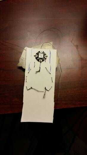 He utilizado un trozo de cartulina (pasó a ser una caja de jabón de barra, pero una caja de cereal o un material similar funcionaría igual de bien) como la estructura de soporte para mi circuito. Cortar cerca de tamaño, luego trazó el contorno de la tiara para ver cuánto más pequeño que quiero cortar. También había trazado mi chip y el LED. Posicioné el LED en la parte orientada al tiara de mi cartulina y GEMMA en el lado opuesto. Les orienté para que las tres rutas de cables no debe cruzar.
