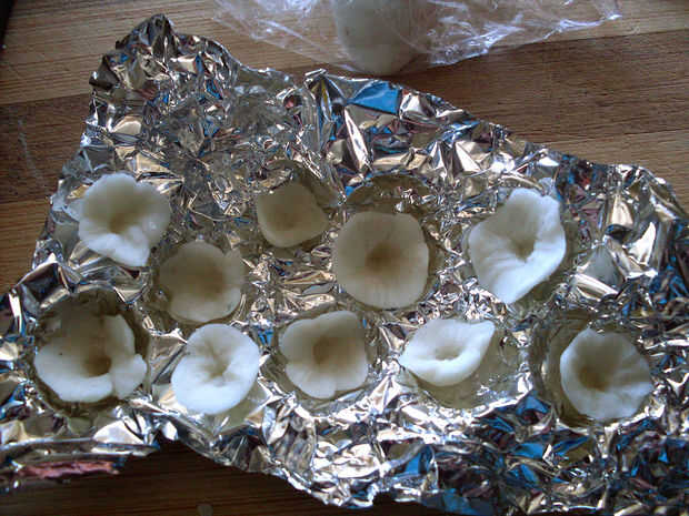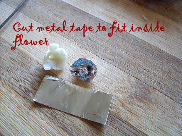 - Entonces pegado la cinta de metal en la parte posterior de la flor primero. Recorte el exceso. El pegado del metal cinta en la parte frontal de la flor.