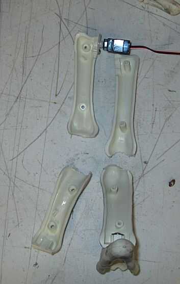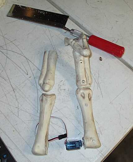 Las piernas se dividen luego en la parte delantera y trasera mitades. Se cortan las mitades en la rodilla por debajo de la rótula. Estos recortes permiten la creación de una flexión de la rodilla.