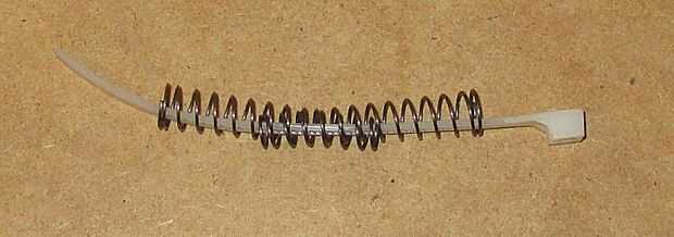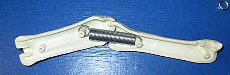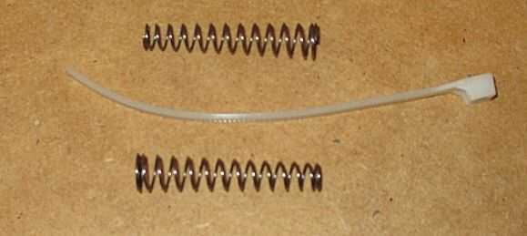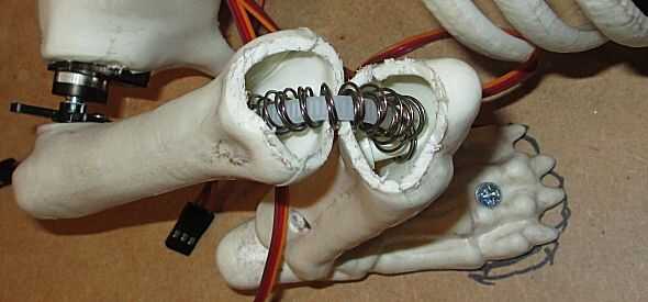 Se trataron de varias combinaciones de bandas de caucho y resortes. El plan básico para una primavera se muestra en la imagen de fondo azul. Finalmente, se encontraron dos cadenas anidadas para proveer el soporte adecuado y volver fuerza. Los resortes están enhebrados por un segmento de la tie-wrap. Luego están anclados a los postes internos de las mitades de pata.