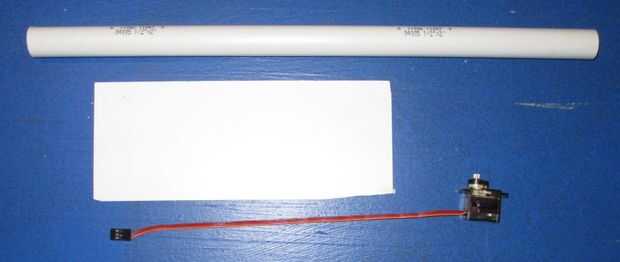 El dispensador está hecho de tres materiales. Un tubo de PVC de diámetro suficiente para tootsie rolls. Una lámina de plástico (un pedazo de chatarra fue utilizado aquí). Y un servo (cuerno del servo no se muestra).