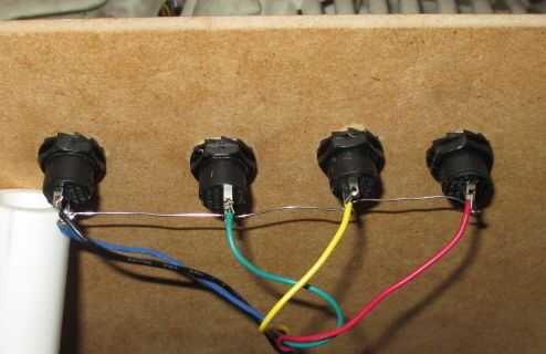 Cuatro interruptores están cableados en la base. Los switches comparten un terreno común y estará conectados al arduino pernos de 7 a 4 con levantan de resistencias.