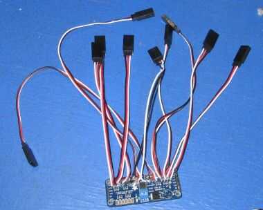 El controlador PWM está cableado con extensores de cable de servo con los extremos eliminados. Servo canales 0 a 3 están cableados de conexión para los servos. Canales 4 al 6, 8 a 10 señal de los cables estén conectados al LED RGB conduce. Líneas de señal de canal 7 y 11 está conectado al ánodo del LED común. Esto requiere la señal de canal 7 y 11 líneas de ser alta para alimentación, mientras que las líneas 4 a 6 y 8 a 10 se mantienen bajas para que puedan iluminar. La próxima vez te uso LED de cátodo común y no atar dos canales PWM. Canales de 12,13 y 15 están cableados para servos. Canal 14 es ningún usada (por ahora).