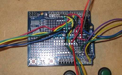 El escudo de arduino está conectado con cuatro juegos de cables. Los cinco a la izquierda ir a los botones de color instalados en la base con azul para la tierra común. El conjunto en la parte inferior son cuatro líneas de disparo a la tarjeta de sonido FX. Los cuatro a la derecha son para potencia y I2C para el controlador PWM. Las dos líneas en la parte superior son energía para el tablero de sonido FX. El conmutador y las líneas de disparo de sonido FX se tiran alto por resistencias soldadas al escudo.