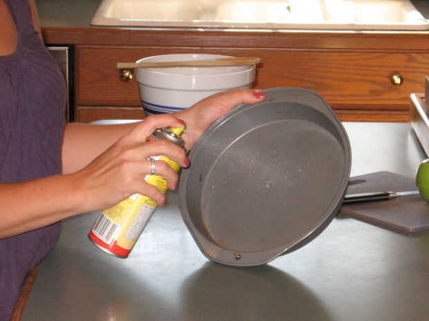 Precalienta el horno a 350 grados. Rocíe un molde para pasteles de 8 pulgadas con aerosol de cocina antiadherente.