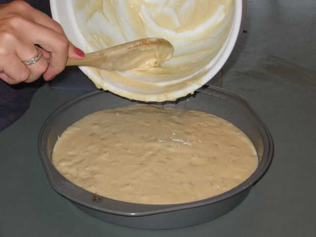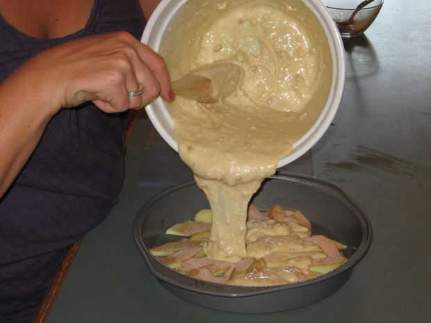 Vierta la masa en el molde de pastel encima de rebanadas de manzana.