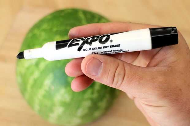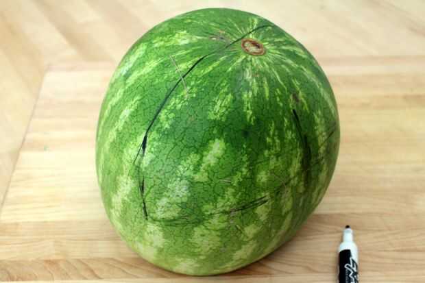 Para ayudar a me plan la forma de la boca usé un seco borrar marcador. Permanente la sandía cortada vertical, bosquejó un contorno de la boca en la parte superior de la sandía en la marca de la madre en la corteza.