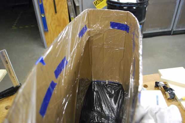 El primer paso en la aleta de tiburón de talla es hacer un molde para la espuma en aerosol. Este es un proceso bastante crudo, por lo que el molde puede ser bastante crudo. El objetivo fundamental es minimizar espuma perdida, así que solo que bastará con un esbozo de la base de la aleta. Forrado el molde en una película para actuar como desmoldante.