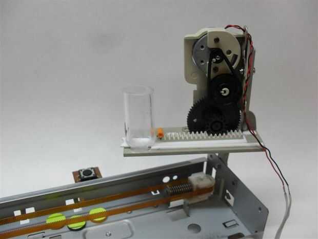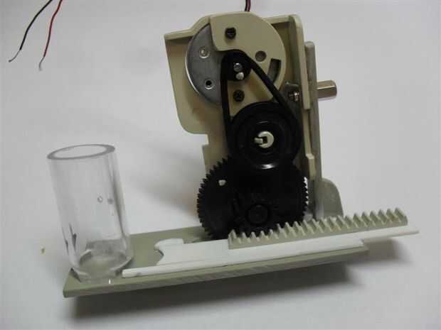 Con el otro motor de lector de DVD (uno que se abre la bandeja de discos) hice este mecanismo de "botón empujando".