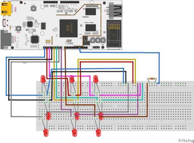 Para el tablero de juego, vamos a utilizar 9 LEDs, conectados a los pines GPIO de la PCDuino. Configurar el tablero como en la imagen de arriba.