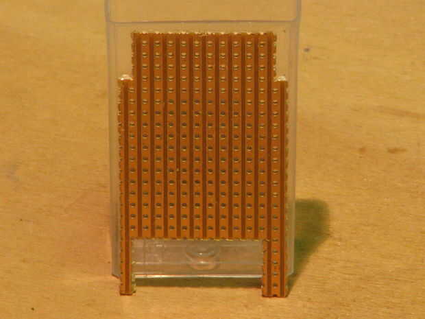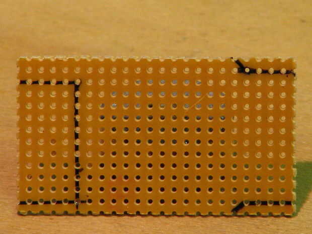 Tomar la placa perforada 22 x 12, marque y corte como se muestra. Para cortar la placa perforada, marcar profundamente con un cuchillo (con una regla) en ambos lados. Luego use un par de pinzas para muy suavemente la flexión. La Junta debe debilitar y romper. Después accidentalmente rompió la delgada pierna así sustituir un perno de cobre amarillo y utilizó esto para conectar el terminal de la batería - ve.