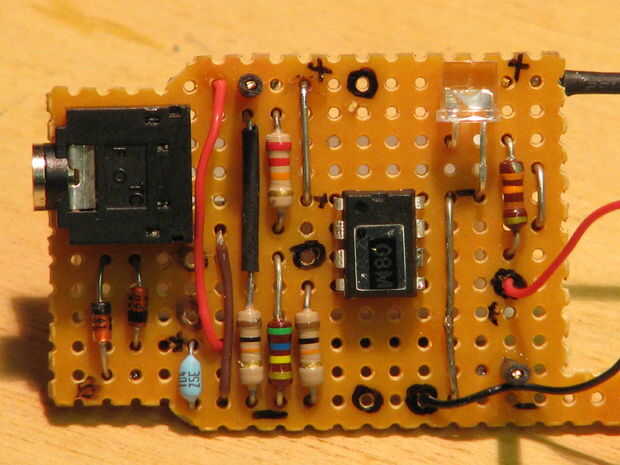 Poner en el zócalo de programación y links primero, luego las resistencias y finalmente los diodos y IC. Normalmente utilizo un zócalo del IC, pero no hay espacio para tales lujos aquí - no ajuste la sonda! Recorte cualquier cosa que se pega por la parte trasera de la Junta para reducir la altura. Dije que esto fue apretado!