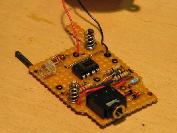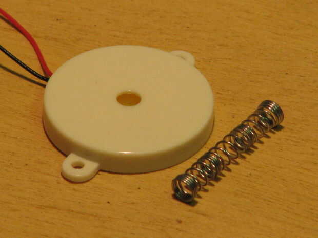 Para el piezo puestos de montaje he utilizado pernos de cobre amarillo de una toma de corriente de IC de wire-wrap, pero haría cualquier alambre soldable. Dos piezas (aprox. 8mm) soldadas en la placa para los mensajes que el receptor acústico piezoeléctrico se sentará en el. Una vez soldado, a granel les fuera un poco con termorretráctiles. Cortar 2 tiras desde el muelle de bolígrafo para que cuando te sientas el resonador en los postes y deslice la placa en la caja, la sonda es soltada contra la parte superior.