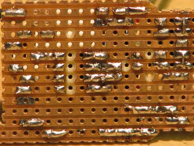 Este diseño desarrollado como he construido, así que busque en la parte delantera y espalda fotos para obtener el componente y cortar pista ubicaciones. Un cortador de manchas de la cara es la mejor herramienta, pero su defecto, use una broca de taladro de mano 5mm (1/4") o un cuchillo. No Asegúrese que puentes finos de pista.
