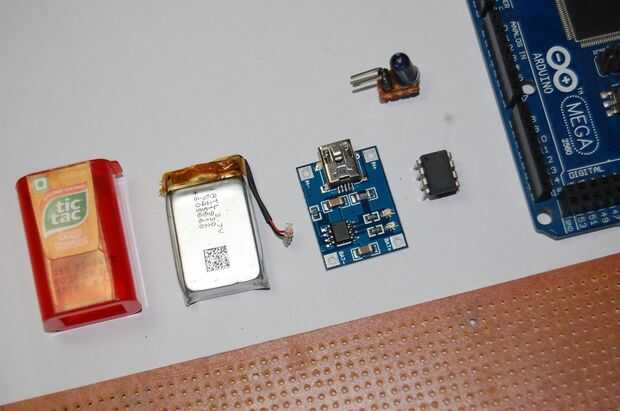 3. Pequeña Batería de iones de litio (sobre 150-300mAh) - lo suficientemente pequeño como para caber en una caja de TicTac