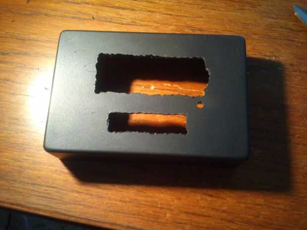 Seguir adelante y hacer 2 agujeros en la tapa de la caja. Medir el tamaño de su pantalla LCD y los 4 interruptores cuando al lado de uno y corte los orificios apropiados. También corté un agujero para el cable de alimentación para el cambio fácil de la batería, pero puede mantener la batería dentro de la caja si quieres.